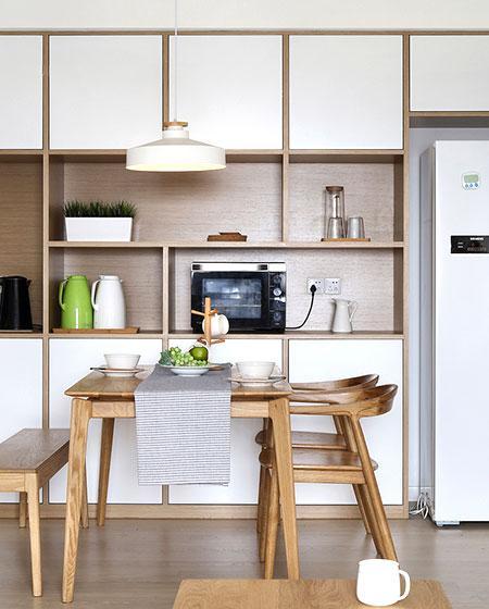 非常實(shí)用的餐邊柜,留了冰箱的位置。上下做成有柜門的收納格,中部挖空可以用來(lái)放酒,還做了微波爐的收納格。