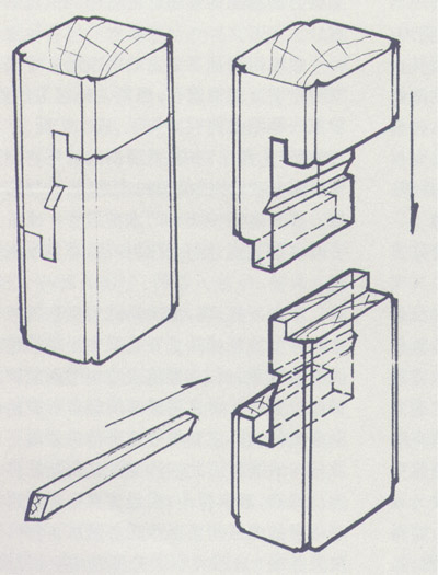半榫破頭楔(圖)破頭楔用在半榫之內,易入難出。破頭楔一旦在半眼的卯里撐開后,榫頭將很難再退出,是一種沒有可逆性的獨特而堅固的結構,最適宜用在像抽屜桌桌面下的矮老等懸垂而負重的部件上。這種作法不常使用,因為它沒法修復,被稱為“絕戶活”。