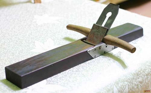 刮刀:一種薄細(xì)的刀片,用較軟的鋼材制成。平直的刮刀用于做平面,有弧度的可以刮有弧度的木件。使用時一般雙手握著,用大拇指抵住中間,與木面成一定斜度向前推(見下圖
