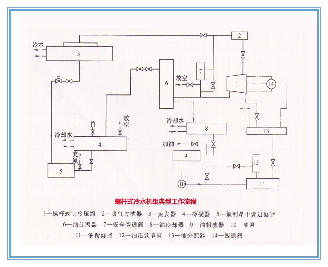 螺桿式冷水機(jī)組的典型工作流程如下圖所示,它由制冷系統(tǒng)和潤滑油系統(tǒng)兩部分組成。制冷系統(tǒng)的工作流程為:制冷劑在蒸發(fā)器中汽化,所產(chǎn)生的蒸氣經(jīng)過吸氣過濾器進(jìn)入壓縮機(jī)。制冷劑在壓縮機(jī)中被壓縮成高壓氣體,同時潤滑油噴入壓縮機(jī)中與制冷劑一起被壓縮,壓縮后潤滑油和制冷劑進(jìn)入油分離器,其中無油的制冷劑進(jìn)入冷凝器,在冷凝器中變?yōu)轱柡鸵后w后進(jìn)入過冷器過冷,變?yōu)檫^冷液體,然后流向節(jié)流閥,經(jīng)過節(jié)流降壓降溫后進(jìn)入蒸發(fā)器。潤滑油系統(tǒng)由油分離器、油冷卻器、油過濾器、油泵、油壓調(diào)節(jié)閥、油分配器和四通閥組成,其工作流程為:從油分離器分離出來的潤滑油,為避免油溫過高降低潤滑性,先經(jīng)過油冷卻器進(jìn)行冷卻,然后在沒泵作用下經(jīng)過油粗濾器、油精濾器進(jìn)入油分配器,接著分成兩路進(jìn)入壓縮同。一路去潤滑軸承并起冷卻作用,另一路去壓縮機(jī)噴射。